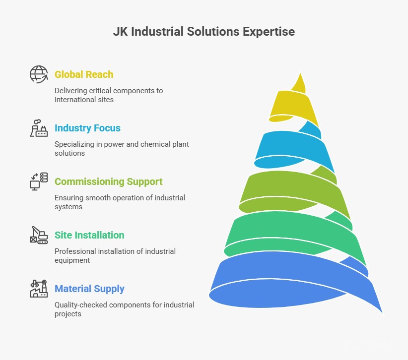 JK Industrial Solutions is a trusted industrial solution provider specializing in material supply, site installation, and commissioning support for Power Plants, Sugar Cogeneration, Process & Chemical Plants, and Waste Heat Recovery Units (WHRU). With a strong export focus, we deliver quality-checked, mission-critical components to international sites.”